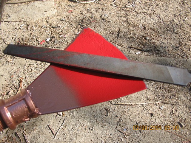 You should ONLY sharpen the wide outside curved edge (convex side). We use a 12" or 14" (better) mill bastard file and lay the blade across one thigh, just above the knee, while sharpening. The narrow inside curved edge (concave side) is filed FLAT, with the file layed FLAT across the blade (See photo below). Just run the file flat across the inside a little to remove the filing burr. You will see a shiny filing mark along one side of the blade. The file should be FLAT across the blade, touching the filing mark and the blade edge at the same time. After filing the 'flat' side, lightly pass the file over the other side again. Note the existing shape, and keep it that way! If you file a curve on the inside concave side, you will RUIN the blade, and it will take you forever to get it flat again. FILE IT FLAT ON THE INSIDE!!!!!!!!!!!!!!!!!!!!!!!!!!!!!!!!!!!. PS. If you look at thousand dollar Japanese Chef's knives, you will notice they are only sharpened on one side........the other side is FLAT.